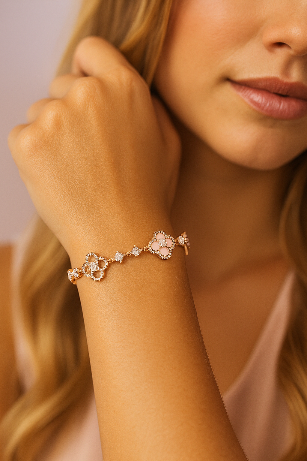 Dieses elegante Armband in Roségold besticht durch ein filigranes Blütendesign, verziert mit funkelnden Kristallen und zartem rosa Emaille.